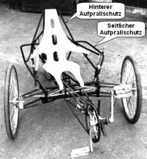 | Aufprall eines PKW von hinten auf Fahrrad oder Velomobil. | Schutzloser Fall mit dem Rücken auf PKW wahrscheinlich. | Schutz des Rückens durch Sitzschale und entsprechende Konstruktion des Fahrgestells möglich. |