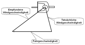 Zunächst etwas zum Vortrieb: Radfahrer haben fast immer das Gefühl, gegen den Wind fahren zu müssen. Aus Bild 6 wird deutlich, warum ein Radfahrer, der im Stand den Wind seitlich von hinten kommend verspürt, diesen Wind umso stärker als Gegenwind empfindet, je höher seine Fahrgeschwindigkeit ist.
