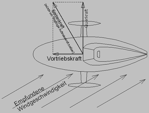 Wenn der Radfahrer statt auf seinem Rad in einem Velomobil sitzen würde, das von oben gesehen wie ein Abschnitt aus dem Flügel eines Windkraftwerks aussieht, hätte er es bedeutend leichter. Wie Bild 7 zeigt, greift am Flügelprofil eine Kraft an, die senkrecht zur Richtung der empfundenen Windgeschwindigkeit wirkt. Beim Tragflügel nennt man sie Auftriebskraft. Hier soll sie als Seitenkraft bezeichnet werden. Diese Seitenkraft kann man in zwei Komponenten zerlegen, von denen die Querkraft senkrecht zur Fahrtrichtung zeigt und durch die Reibkraft der Räder aufgehoben wird. Die andere Komponente zeigt in Fahrtrichtung und wird als Vortriebskraft wirksam. Diese den Seglern bestens bekannte Kraft wird auch vom Velomobilfahrer deutlich gespürt. Sie sorgt dafür, dass bei seitlich auftreffendem Gegenwind die vom Fahrer aufzubringende Leistung erheblich herabgesetzt wird [Fuchs 1993].