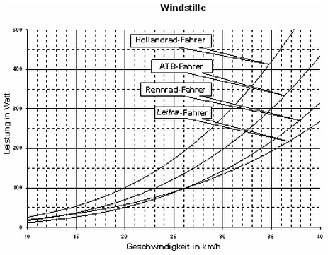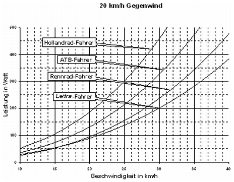 Soviel zur Nutzung von Seitenwind durch ein aerodynamisch gut gestaltetes Velomobil. Doch auch bei Windstille oder senkrecht von vorn auftreffendem Gegenwind kann ein solches Velomobil wegen seiner »Windschnittigkeit« Pluspunkte sammeln. Das soll an den Bildern 8–10 gezeigt werden, wo die Fahrleistungen von Radfahrern auf unterschiedlichen Fahrrädern mit der Fahrleistung des Fahrers in einer »Leitra« bei Windstille und bei 20 km/h Gegenwind verglichen werden. Dabei wird aus den zu den Bildern angegebenen Voraussetzungen deutlich, warum bei niedrigen Geschwindigkeiten und Windstille die »Leitra« mehr Fahrleistung erfordert als das Rennrad. Es liegt am höheren Rollwiderstand und am wegen eines Zwischengetriebes etwas geringeren Wirkungsgrad von Kettengetriebe plus Schaltung. Erst bei höheren Geschwindigkeiten wiegt die »windschnittigere« Form des Velomobils diesen Nachteil auf. Bei Gegenwind von 20 km/h ist für die »Leitra« bereits ab 10 km/h Fahrgeschwindigkeit die erforderliche Fahrleistung geringer [Senkel 1993] [Staubach 1993] [Pivit 2000].