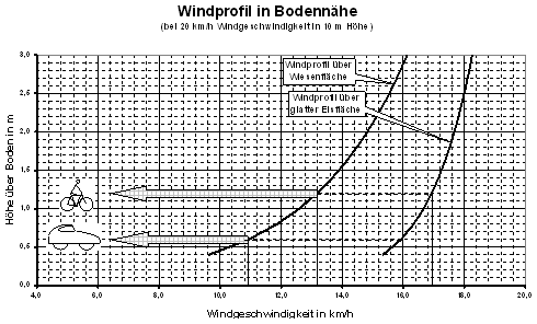 Bei Gegenwind wird aber noch ein weiterer Vorteil des Velomobils wirksam. Bild 11 zeigt, welcher Nutzen sich dann aus der bodennahen Lage der Querschnittsfläche eines solchen Fahrzeugs ziehen lässt: Die Geschwindigkeit des Windes sinkt in der bodennahen Grenzschicht bis auf den Wert Null am Boden ab. Diese Grenzschicht ist umso dünner, je glatter der Boden ist, über den der Wind weht. Im Bild sind unter der Voraussetzung, dass in 10 m Höhe eine Windgeschwindigkeit von 20 km/h herrscht, die Geschwindigkeitsabnahme über einer mit Gras bewachsenen Ebene und die Geschwindigkeitsabnahme über einer Eisfläche dargestellt [Claußen 1991]. Man erkennt leicht, dass bei Fahrt durch eine mit Gras bewachsene Ebene die »Leitra« mit ihrem etwa 60 cm großen Abstand zwischen Querschnittsflächenschwerpunkt und Erdboden nur knapp 11 km/h »spürt«, während der Radfahrer mit etwa 120 cm Bodenabstand es mit über 13 km/h zu tun hat.