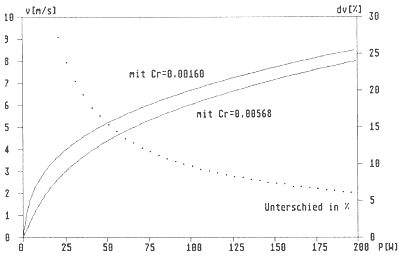In Bild 1 geben die durchgezogenen Kurven die erreichbare Geschwindigkeit bei gegebener Leistung für zwei verschiedene Reifen an (bei einem Fahrrad mit Fahrer von m = 100 kg und cw ∙ A = 0,5 m2). An der gepunkteten Kurve kann man ablesen, welchen Geschwindigkeitszuwachs man bei gegebener Leistung hat, wenn man den Rollwiderstandsbeiwert von cR = 0,00568 auf cR = 0,00160 senkt. Dies entspricht in etwa der Spanne zwischen einem eher schlechten und einem sehr guten Meßergebnis des Rollreibungskoeffizienten (jeweils 20″-Bereifung bei gleichem Druck von 5 bar). Mit 75 W Leistung (der Dauerleistung eines durchschnittlichen Radlers) würde man dann 12 % schneller fahren können. Selbst bei 200 W Leistung beträgt der Zuwachs noch über 6 %.