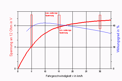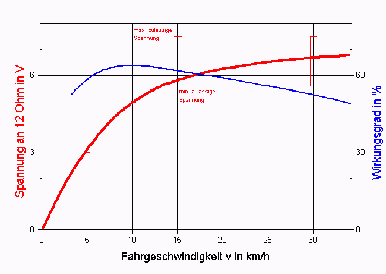 Da ein Generator unbewegt gar keine und bei geringer Drehzahl nur wenig Spannung erzeugt, muss auf die Forderung nach geschwindigkeitsunabhängiger Leistungsabgabe verzichtet und stattdessen eine mit zunehmender Geschwindigkeit möglichst schnell bis zum Nennwert ansteigende Spannung/Leistung gefordert werden. Entsprechend steht in der TA 24: Mindestens 3 V bei 5 km/h, mindestens 5,7 V bei 15 km/h und maximal 7,5 V für Geschwindigkeiten bis 30 km/h (s. Bild 3).