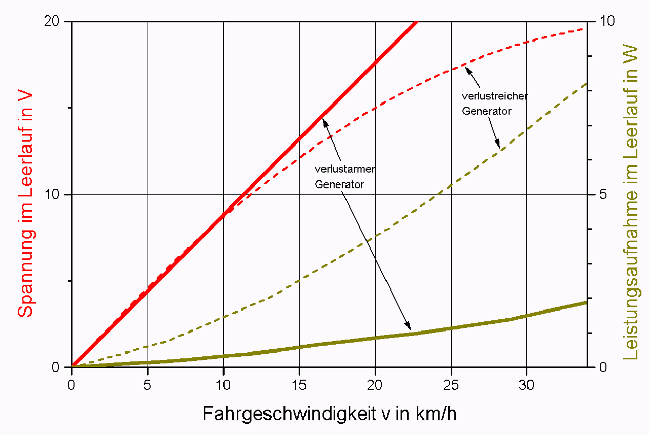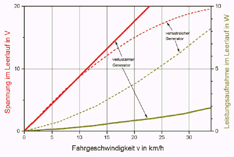 Bei ständig mitlaufenden Nabendynamos ist die Leistungsaufnahme im Leerlauf von Bedeutung. Sie steigt nach diesem Modell zunächst quadratisch mit der Geschwindigkeit an und übersteigt ab einer gewissen Geschwindigkeit die Leistungsaufnahme unter Last. Bei verlustreichen Generatoren kann dies schon im relevanten Geschwindigkeitsbereich (unter 30 km/h) liegen (Bild 5). Bei solchen könnte man durch Kurzschließen des Stromkreises (statt des üblichen Unterbrechens) die Leerlaufverluste verringern.