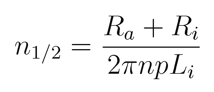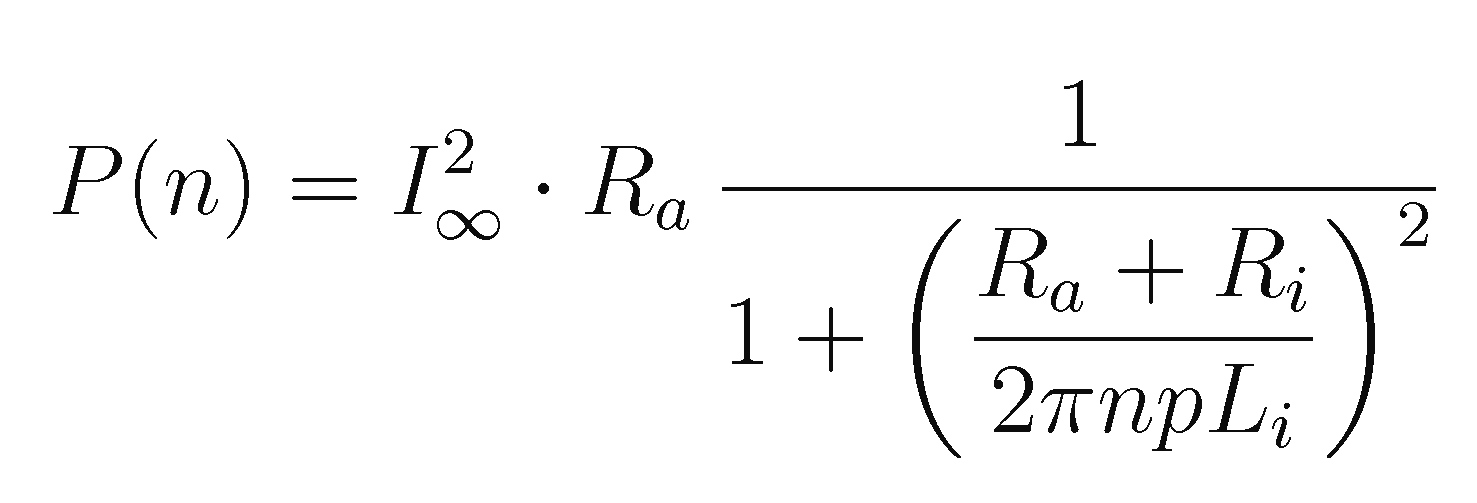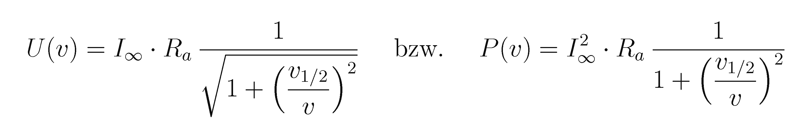 Der Term ergibt die bekannte gekrümmte Form der Lastkennlinie eines Fahrraddynamos (Bild 3), die Größe l∞ ∙ Ra ist die Grenzspannung für hohe Geschwindigkeit, v1/2 die Geschwindigkeit, bei der die halbe Grenzleistung bzw. der √2-te Teil der Grenzspannung erreicht wird. l∞ kann auch als der Strom gedeutet werden, der notwendig ist, das Magnetfeld des Dauermagnetrotors komplett aus der Spule zu verdrängen.