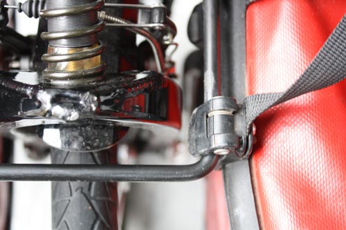 Backroller Classic lassen sich ebenfalls an den Lowrider montieren. Allerdings muss man dann die Haken z. B. mit einer Schlauchschelle am Abrutschen nach hinten hindern. Inwiefern dies in der Praxis sinnvoll ist, muss sich auch auf Grund der knapperen Bodenfreiheit erst noch zeigen. Ich habe die Hinterrad-Taschen nur testweise vorne angehängt.