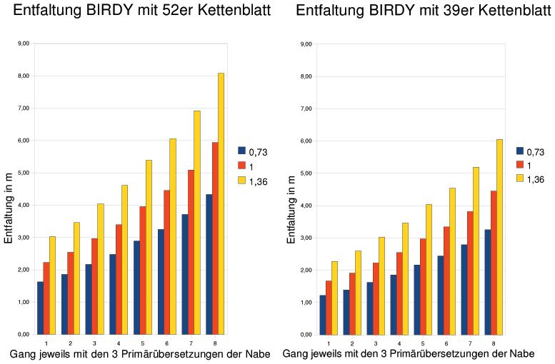 Leider nutzt RM diese Möglichkeiten nicht, um eine wirklich berg- und gepäcktaugliche Minimalübersetzung anzubieten. Vielmehr soll sich der Kunde an Steigungen mit einer Entfaltung von 1,73 m zufrieden geben, welche ihn bei einer Trittfrequenz von 90/min zu einer Geschwindigkeit von über 9 km/h zwingt. Was der Reiseradler mit 8,81 m Entfaltung für den schnellsten Gang anfangen soll, erschließt sich dem Autor erst recht nicht.