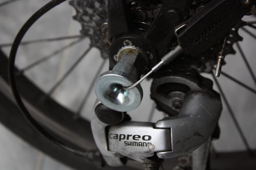 Die maximale Zuladung des Lowriders von 10 kg muss man schon ausnützen, will man mehr als die Hälfte des Gepäckgewichts nach vorne bringen. Er besteht aus einem minimalistischen Stückchen Aluminiumdraht, welches seine Funktion jedoch gut erfüllt. Lenk- und Federungseigenschaften bleiben auch beladen gut. Ortlieb Frontroller Classic lassen sich problemlos verwenden und sitzen sicher. Viel Platz haben die Haken (QL1) aber nicht (vgl. Bild 7). Bei sperrigen Befestigungsystemen anderer Hersteller ist ausprobieren angesagt. Aufpassen muss man auch bei dem unten am Ausfallende befestigten Alubügel, um sicherzustellen, das dieser nicht an der Hinterwand der Packtasche scheuert.