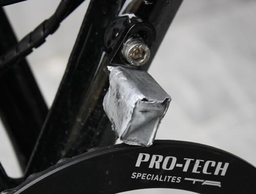 Und die Trinkflasche? Wohin mit diesem Quell der Erfrischung auf langen, heißen Durststrecken? Der Autor ist zwar mitnichten der Meinung, dass ein »anständiges« Reiserad ein ganze Batterie Flaschenhalter braucht, aber eine Flasche griffbereit zu haben ist schon praktisch. Serienmäßig hat unser Falt-Touring-Bike da nix auf Lager. Bastler haben seitlich am Vorbau mit Flaschenhaltern experimentiert. Eine simple Lösung: Eine schnöde 0,5-Liter-PET-Flasche wird kopfüber senkrecht zwischen die Gepäckträgerstreben oder die Schwingenarme nahe des Dämpferwiderlagers geklemmt. Das hält und ist einigermaßen greifgünstig. Nur zum Falten muss man sie natürlich entfernen.