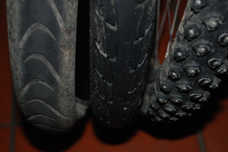 Seit einer Woche habe ich meine guten Nokian-Spikes montiert. Wegen der relativ großen Reifenbreite von 54 mm musste ich einige Veränderungen an den Schutzblechen vornehmen. Es ist sehr eng, aber grundsätzlich funktioniert es. Der Rollwiderstand ist höher, aber erträglich. Mir ist die Sicherheit in diesem Fall wichtiger.