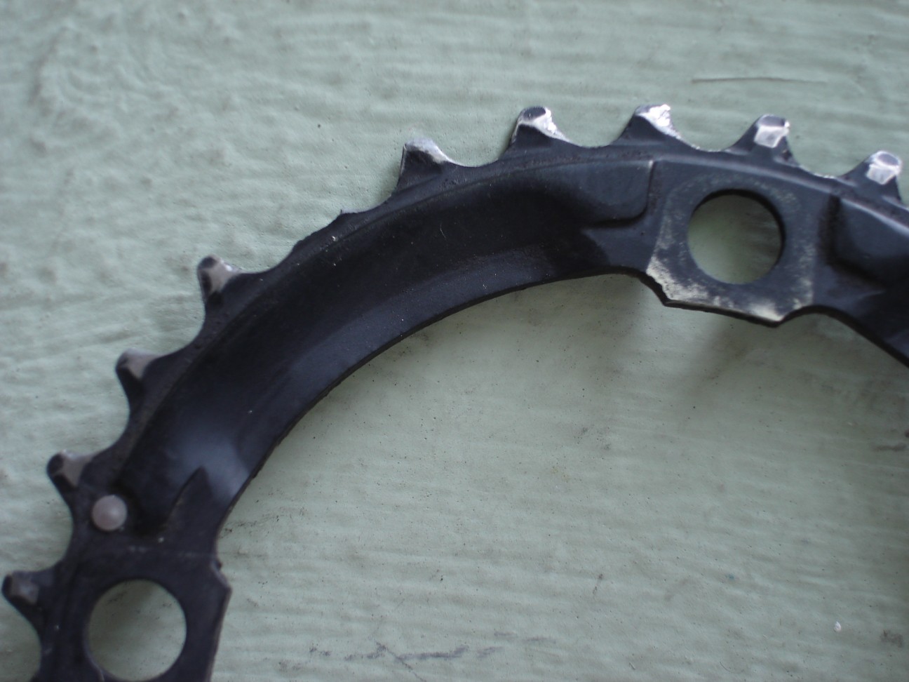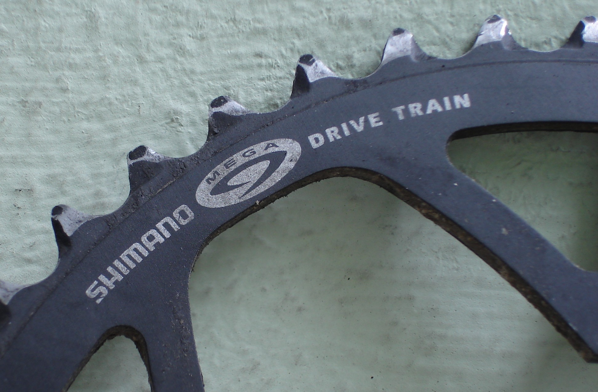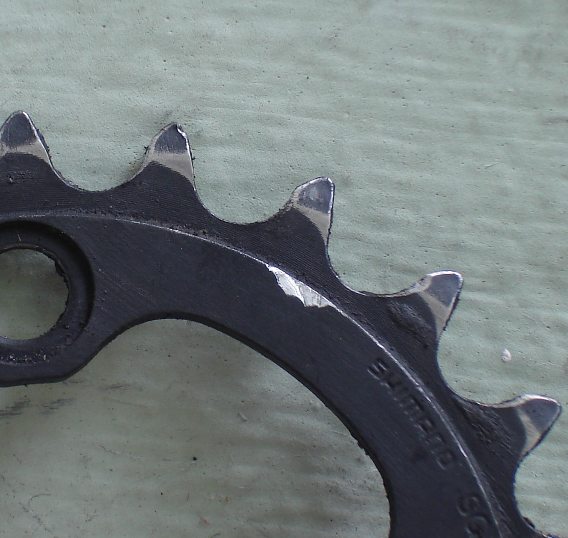 Bei einem Neuerwerb eines Mountainbikes vor einigen Jahren legte ich Wert auf Wartungsarmut. So entschied ich mich auf Empfehlung des Radhändlers als Tretlager für eine Shimano-XT-Bestückung. Wie sich bald herausstellte, war dies die falsche Wahl. Bereits nach 2.000 km waren alle 3 Kettenblätter stark abgenützt, die gehärtete Oberfläche hatte also nicht lange gehalten. Nach 5.000 km waren schon von einigen Zähne die Spitze gekappt, und einer beim mittleren Kettenblatt völlig abgebrochen (siehe Bild 2), obwohl ich, denke ich, schalten kann, und die Kettenblätter näherten sich dem Bild eines Sägeblatts.
