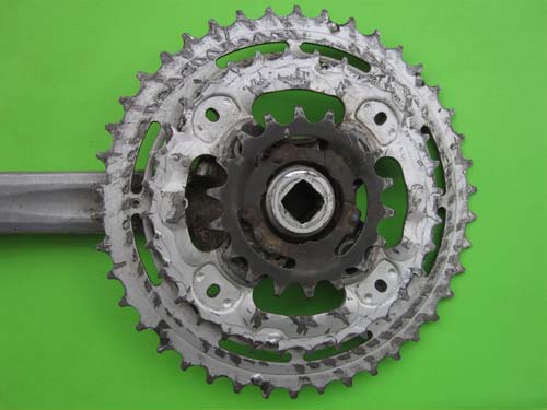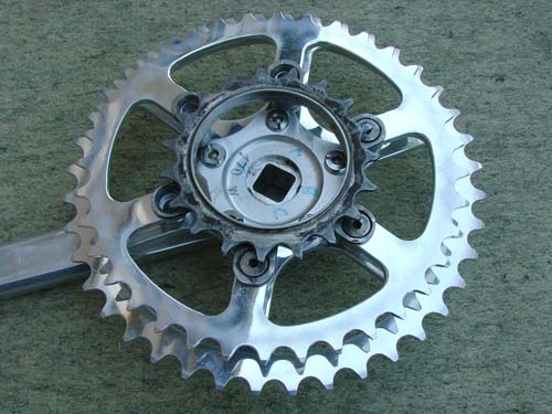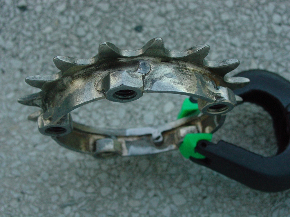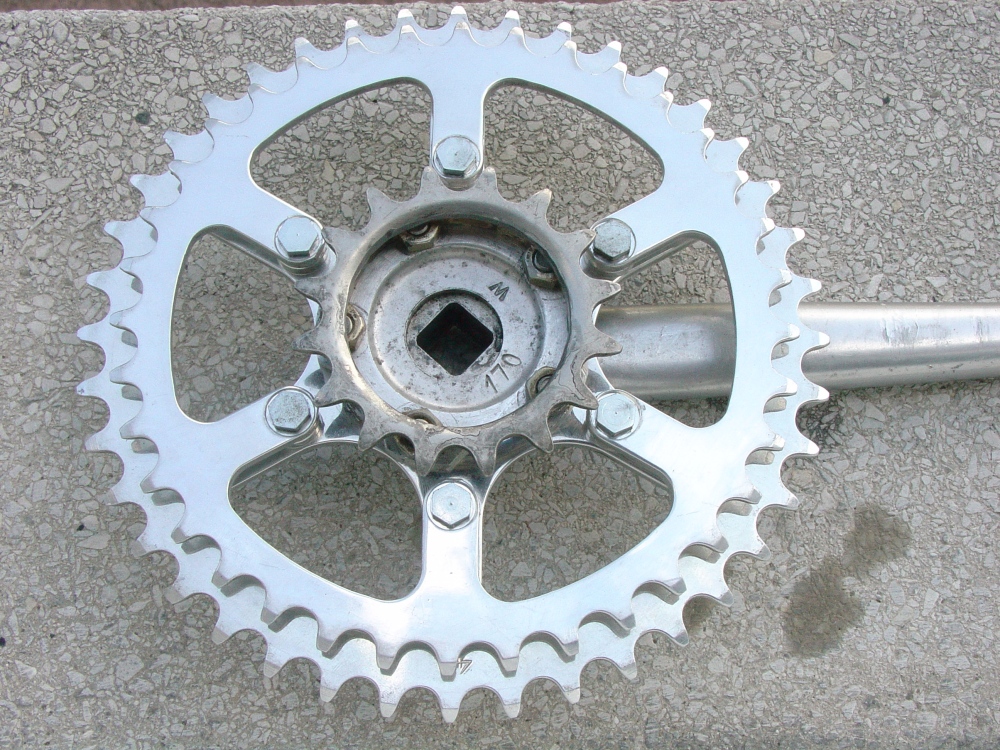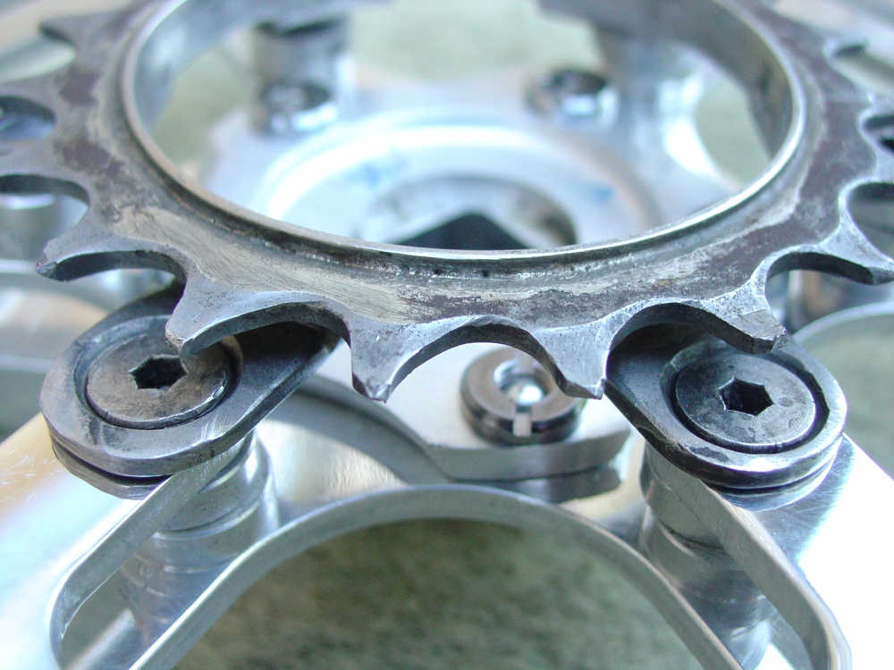 Weiter ging es mit 19 Zähnen. Das war ein Sachs-Dreigangritzel, mit einer aufwendigen Edelstahl-Spider-Konstruktion am großen Lochkreis (6 Bohrungen) der Kurbel befestigt. Das schlug sich, in Anbetracht seiner Größe, ganz ordentlich.