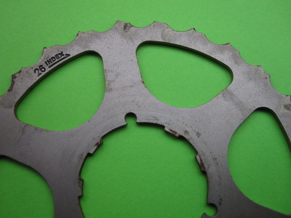 Mein erstes 24er war ein Glücksgriff: Ein harteloxiertes Aluritzel für einen Rennzahnkranz, französisches Fabrikat. Angesichts der albernen, charakteristischen Längsnut in der Zahnspitze, die bei ungenauem Schalten gerne »Zwischenleerläufe« erzeugt, weil die Kettenlaschen darin einspuren, tippe ich auf Maillard.