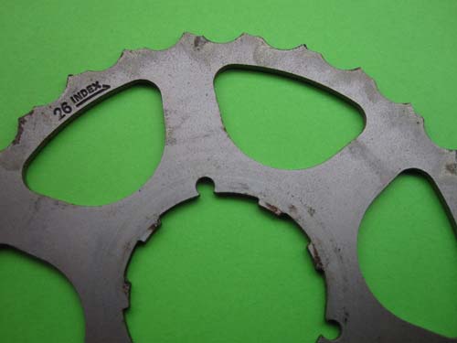 Bei Ritzeln (Zahnkranz, hinten) gibt es wesentlich festeres, zum Teil sogar ordentlich gehärtetes Material, z. B. Dura-Ace oder die guten alten Dreigangritzel. Aber auch das Härten kann man übertreiben: Härter und fester bedeutet auch spröder. »Totgehärtete« Ritzel neigen zu Zahnausfall. Bei hohen Belastungen (z. B. durch eine neue Kette, deren Teilung nicht mit der eines nicht mehr neuen Ritzels übereinstimmt und darauf erst einlaufen muss) können die Zähne regelrecht abgehebelt werden: Sie reißen am Zahnfuß ein und fallen aus, Beispiel Dura-Ace Uniglide, siehe Bilder 2 und 3.