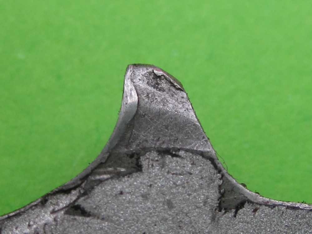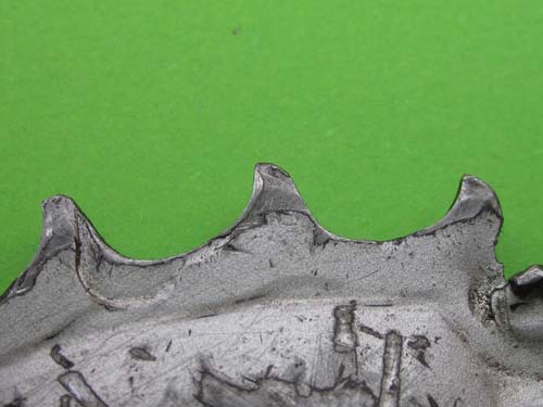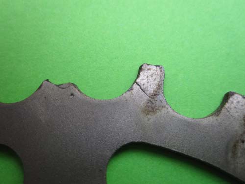Der zweite Einflussfaktor ist die von den Kettenrollen aufgebrachte Pressung am hinteren Zahnrücken, von mir als Quetschung bezeichnet. Diese Verschleißart ist besonders an (zu) weichen Kettenblättern deutlich sichtbar – siehe Bilder 5 und 6: Das Material wird regelrecht zur Seite weggequetscht und dann von den daran scheuernden Kettengliedern abgerieben.