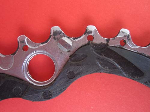 Diesen Eindruck habe ich auch von der Einfassung des Kettenblattes mit kurzfaserverstärktem Kunststoff, als »Karbon« beworben und vermutlich Spritzguss: Sie unterstützt die Kettenführung auf die Steighilfen. Der Aussteifungseffekt hingegen dürfte nicht groß sein – und bei dem rund 1,9 mm dicken, kurz verankerten Stahlblatt im »Windschatten« des großen Blatts auch nicht notwendig. Die Kettenführung hätte man bei geeigneter Konstruktion (Formung des Blatts) wohl ohne Gewichtsnachteil auch aus Stahl machen können. Ansonsten scheint es mir im Hinblick auf die bei der Verbrennung des Kunststoffs entstehenden, vermutlich nicht ungiftigen Stoffe nicht gerade eine Umweltauszeichnung zu verdienen. Bisher sind Kettenblätter absolut oder wenigstens fast sortenrein, und das sollte meiner Meinung nach so bleiben – es sei denn, die Verbundbauweise bietet einen echten technischen Vorteil, den ich hier allerdings nicht sehen kann. Gleiches gilt für die altbackene Achtziger-Jahre-Tuning-Optik der winzigen 32 Erleichterungsbohrungen: Sieht schnell aus, aber der Gewichtsvorteil geht gegen null – schade um den Aufwand.