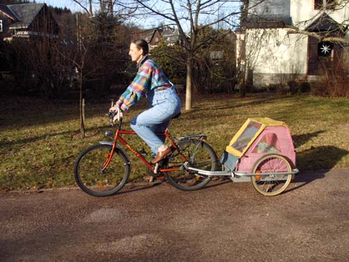 In allen drei Schwangerschaften bin ich also Rad gefahren, mit Ausnahme der Zeit, wo ich hormonumstellungsbedingt sowieso auf der Couch zubringen durfte (eine Kombination aus Spucken und mehr oder weniger Kreislaufzusammenbrüchen). Problematischer war eigentlich die Zeit nach der Entbindung, weil alle mit Kaiserschnitt kamen und infolge dessen eine Reihe von Bewegungen dann natürlich erst einmal nicht ging. Dann war das Problem der Knocheninstabilität von Babies für uns wichtig, so dass wir erst mit etwa 9 Monaten die Kinder im Maxicosi im Hänger angeschnallt haben. d. h. nur selten nutzte ich in den ersten 9 Monaten das Rad, weil ich meistens ja mit Kindern unterwegs war. Stets eine Zeit, die ich als lang empfand.