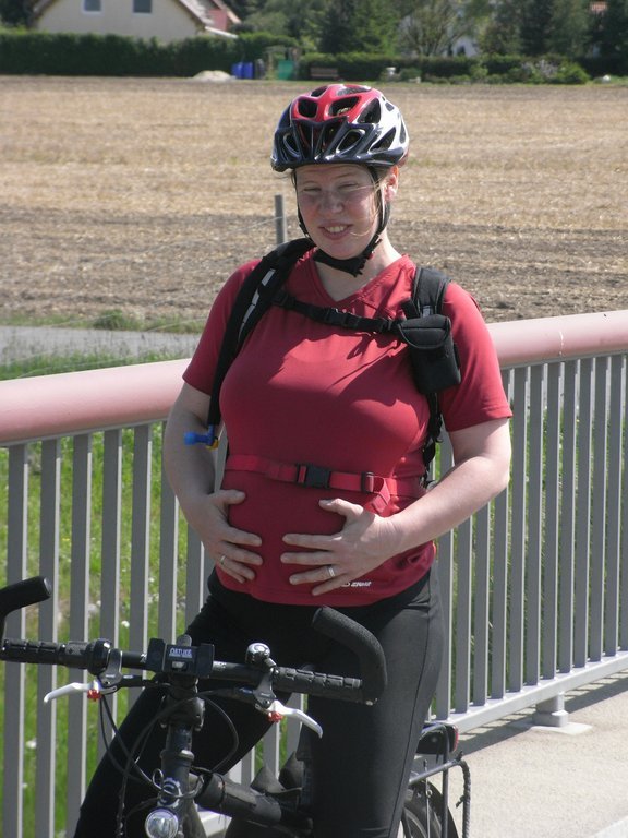 Eigentlich bin ich bis zum Mutterschutz Rad gefahren und ich muss sagen, die Bewegung hat mir und dem Kind gut getan. Bei mir gab es zudem noch den Verdacht, dass ich Schwangerschaftsdiabetes haben könnte. Wirklich alle Ärzte haben gesagt, gut dass Sie sich bewegt haben. Manche Mitmenschen haben nicht verstanden, dass ich schwanger Rad gefahren bin. Die größte Gefahr ist sicherlich ein Sturz, aber durch vorsichtiges Fahren kann auch dies vermieden werden. Stürzen kann man auch in der Straßenbahn. Bei meinem Fahrrad hat mein Mann den Lenker ein wenig höher gestellt, das ging alles ganz wunderbar. Auf dem Foto bin ich im 6. Monat schwanger.
