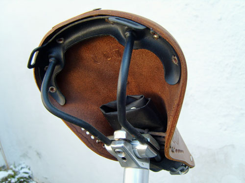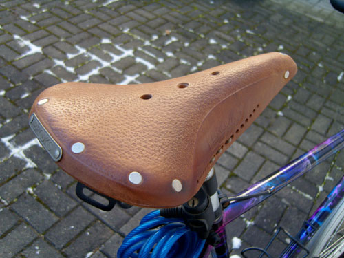 Ich benutze den Überzug aber nur, wenn ich mein Fahrrad abstelle. Während der Fahrt ist der Sattel ja durch mich und durch das hintere Schutzblech geschützt. Für Fahrräder ohne Schutzblech ist er im Regen nicht geeignet, da er von unten vom Spritzwasser nass werden kann. Und da unten ist er empfindlicher als oben. Da unten muss er ja auch eingefettet werden, die Oberseite bekommt nur einen Hauch Sattelfett ab. Man muss den Sattel schon selber einsitzen, damit er sich richtig anpasst und bequem wird. Und wenn er dann richtig »eingeritten« ist, ist er ein Unikat.