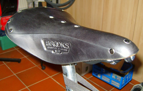 Hatte ich wirklich alle Arten von Sättel probiert? Nein! Um eine Art von Sätteln hatte ich immer einen großen Bogen gemacht. Anfang der 80er-Jahre waren Kernledersättel antiquiert und etwas für »alte Säcke«. Sie kamen für mich allein schon aus optischen Gründen nicht in Frage. Retro war damals noch nicht schick. Aber auch weil sie so kompliziert sind: Kernledersättel dürfen nicht nass werden, müssen eingefettet und gespannt werden und vor allen Dingen müssen sie »eingeritten« werden. Mein Vater hatte schon seit vielen Jahren einen Brooks-Sattel an seinem Wanderfahrrad. Er hat ihn nie gepflegt und deshalb sieht er auch ziemlich vergammelt aus. Da ich mittlerweile selber ein »alter Sack« geworden bin, wollte ich nun doch mal so einen Brooks-Sattel ausprobieren. Die Bewährungsprobe musste er ja nicht gleich bei einer Radtour bestehen. Aus Furcht vor den Qualen beim Einreiten hatte ich mich für einen bereits vorgegerbten Brooks-Sattel Modell B17 Aged entschieden.