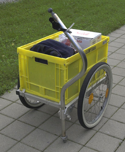 | Einkaufsanhänger (ähnlich den Einkaufscaddies) | Winther Donkey | komplett ohne Umbau als Einkaufswagen nutzbar, sehr leicht ab- und ankuppelbar, als Handwagen sehr kompakt | Ladefläche im Fahrradbetrieb schräg geneigt und ändert sich beim Umbau zum Handwagen, kleine Ladefläche, Ladefläche am Beispiel durch Gitterboxaufbau wenig flexibel (keine überstehende Ladung möglich), meist eine sperrige Kupplung oder gar ein Spezialgepäckträger notwendig |