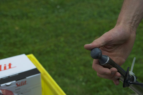 Am kurzen Ende der Deichsel ist eine Lenkrolle aus dem Baumarkt befestigt. Wenn die Deichsel senkrecht steht, bildet die Lenkrolle einen dritten Aufstandspunkt. Die Deichsel aus Edelstahlwasserrohr wurde von einem Heizungsbauer maschinell gebogen. Mit dem Schnellspanner kann die Achse zwischen den Aluplatten geklemmt werden. Das ist ausreichend, um die auftretenden Momente aus der Stützlast zu übertragen. Die Entwicklung einer formschlüssigen Sicherung, die ebenso einfach zu bedienen ist wie die jetzige Deichselbefestigung, steht noch aus.