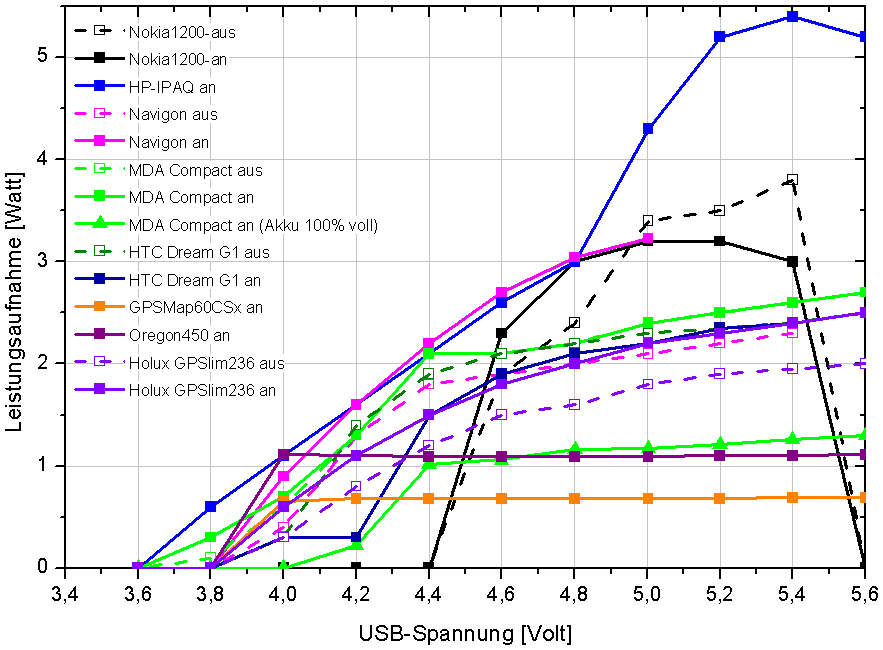Zunächst gilt es zu untersuchen, welche Leistungsaufnahme übliche Mobilgeräte aufweisen. Dazu werden sie über den USB-Anschluss mit einer Gleichspannung zwischen 3 und 5,6 Volt versorgt.