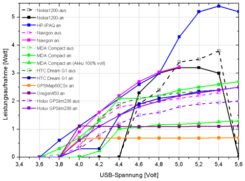 Wie man sieht, muss die Versorgungsspannung je nach Gerät mindestens zwischen 3,6 und 4,4 Volt betragen, damit überhaupt Strom fließt. Geräte ohne Akkuladefunktion wie die Garmin Outdoor-GPS-Geräte Oregon 450 und GPSMap 60CSx oder ein voll geladenes Smartphone benötigen 0,7 bis 1,2 Watt. Wenn Akkus geladen werden müssen, liegt die Leistungsaufnahme bei Smartphones im Bereich 2 bis 2,5 Watt. Bei dem Nokia-Handy, dem Auto-Navigationsgerät und dem PDA steigt die Leistungsaufnahme stark mit der Spannung an. Während bei 4,6 Volt noch 2 bis 2,5 Watt verbraucht werden, sind es bei höheren Spannungen deutlich über 3 Watt. Die Hintergrundbeleuchtung macht dabei mehr als 0,5 Watt aus. Als Navigationshilfe tagsüber am Fahrrad genutzt, wird man aber nahezu immer mit maximaler Beleuchtung arbeiten, da man die Displays sonst schlecht ablesen kann. Die Messdaten beziehen sich daher immer auf 100 % Licht.