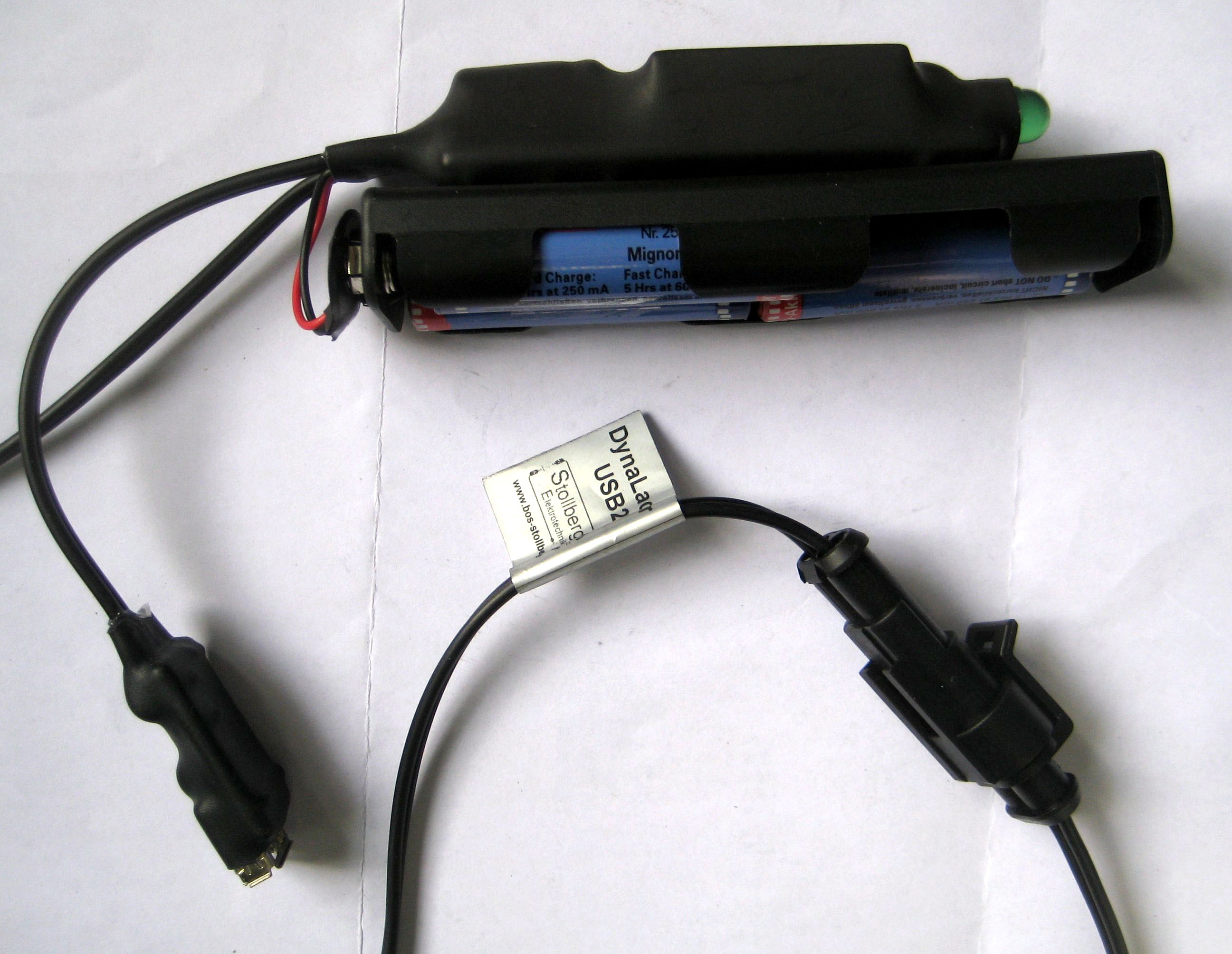 Am längsten auf dem Markt sind die Geräte von Stollberg Elektrotechnik. Die Variante Dynalader Direkt ist mit 29 € das preisgünstigste käufliche Gerät. Es stellt schlicht eine USB-Buchse zur Verfügung. Die Variante Dynalader USB2 verfügt über einen Halter für 4 NiMH-Zellen im AA-Format, die als Puffer für den USB-Ausgang dienen oder auch zum Betrieb in anderen Geräten geladen werden können. Eine große grüne LED signalisiert, ob geladen wird. Die Elektronik ist schmucklos in einem Stück Schrumpfschlauch versteckt. Als Zuleitungen zum Akkupack dient der klassisch-empfindliche Anschluss für 9 V-Blocks. Sinnvollerweise wird man diese Geräte in einer Lenkertasche betreiben.