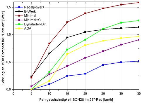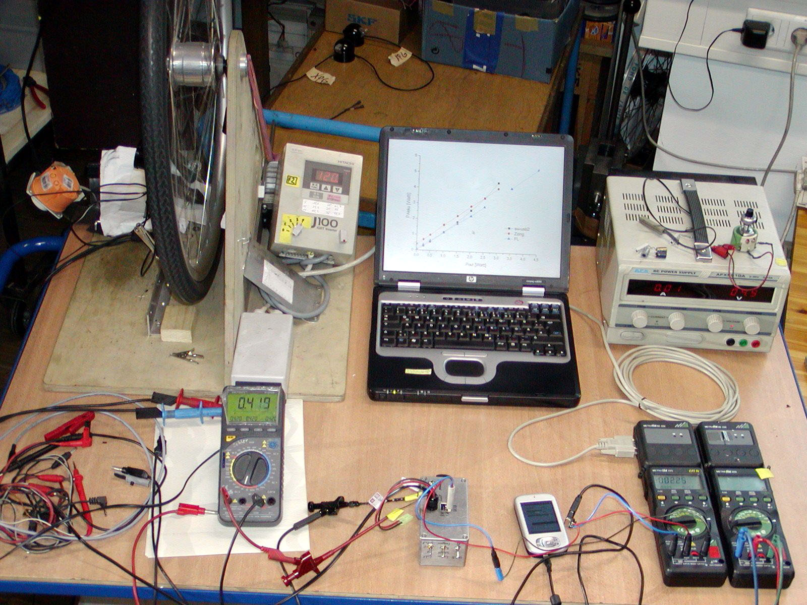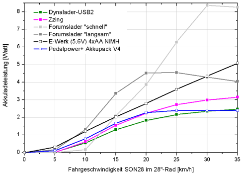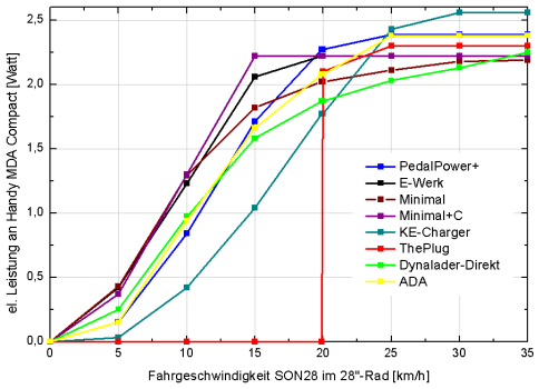 Wie zuvor gezeigt, brauchen die meisten Mobilgeräte zwischen 0,7 und 3 Watt. Das als Beispiel dienende MDA Compact braucht zum Aufladen etwa 2,3 Watt. Ein guter Ladeadapter sollte diese Leistung bei möglichst niedrigem Tempo und bei möglichst gutem Wirkungsgrad bereitstellen. Getestet wurde hier an einem 28″-Laufrad mit SON28 und regelbarem Reibradantrieb. Ein auf 700 mm Durchmesser kalibrierter Fahrrad-Tacho misst die Drehzahl. Am Wechselspannungs-Eingang und am USB-Ausgang wird die Leistung mit je einem Metrahit GMC29s bestimmt. Dank gilt Olaf Schultz, der ein GMC29s zur Verfügung stellte, unabhängige Kontrollmessungen unternahm und immer wieder als Diskussionspartner zur Verfügung stand.