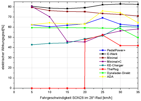 Ab reichlich 20 km/h liefern alle Geräte genug Leistung, um das MDA Compact mit vollem Ladestrom zu versorgen. Wer allerdings häufiger langsamer unterwegs ist, erlebt große Unterschiede: Während die Billig-Lösung »Minimal«-Lader plus Serienkondensator bei 15 km/h immer noch mit vollen 2,2 Watt glänzt, liefert der KE-Charger nur noch die Hälfte und »The Plug« schaltet ganz ab. Bei ToutTerrain vertritt man die Position: Entweder volle 5 Volt oder gar nichts, da manche Verbraucher bei schwankender Spannung Probleme bereiteten. Das E-Werk ist bei mittlerem Tempo das stärkste kommerzielle Gerät und zudem über den gesamten Drehzahlbereich mit Abstand der Effizienz-Sieger bei um die 80 % Wirkungsgrad. Erstaunlicherweise liegt die Minimal-Bastellösung (ohne Serienkondensator) aber nicht so viel schlechter.