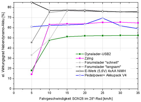 Bei den Ladeadaptern mit Akkupuffer betrachten wir zunächst nicht den Fall Nabendynamo-zu-USB sondern Nabendynamo-zu-Akku. Die Geräte wurden dazu geöffnet und Strom und Spannung direkt am Akku gemessen. Beim ADA Bikeconverter mit Akkupuffer ist das zerstörungsfreie Öffnen des Gehäuse nicht möglich – daher bleibt dieses Gerät hier außen vor. Weit überlegen zeigt sich der Forumslader. In der Einstellung »langsam« sorgt er bereits bei 15 km/h für über 3 Watt Ladeleistung am Akku, während die beste kommerzielle Lösung E-Werk mit 4-Zellen NiMH-Akku nur gerade für 2 Watt sorgt. Bei 30 km/h beeindruckt der Forumslader mit 8,5 Watt – das reicht, um auch stromhungrige Geäte für lange Fahrpausen zu versorgen. Die Messungen für das E-Werk gelten nur für den Fall eines leeren Akkupacks im guten Zustand. Die Spannungsbegrenzung auf 5,6 Volt sorgt bei leicht gealterten Akkus mit erhöhtem Innenwiderstand dafür, dass der Ladestrom schnell zusammenbricht und somit weniger Ladeleistung genutzt werden kann. Bezüglich Effizienz kann der Forumslader dem exzellenten E-Werk paroli bieten. Der Dynalader-USB2 entäuscht hingegen mit nur reichlich 50 %.