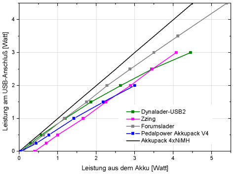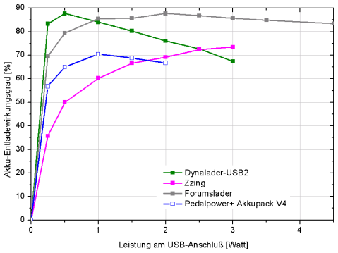 Nach dem Akku-Laden gilt es, das Entladen zu betrachten. Auch hier schneidet der Forumslader sehr gut ab, indem er die Energie aus dem Akku mit über 85 % am USB-Ausgang verfügbar macht. Der Dynalader weiß diesbezüglich bei geringen Strömen zu gefallen. Der Zzing hingegen entäuscht gerade in diesem Bereich. Um ein voll geladenes Handy oder GPS-Gerät mit 1 Watt zu versorgen, sind hier mehr als anderthalb Watt aus dem Akku nötig. Teil des Problems scheinen hohe Leerlaufverluste zu sein – bei Nichtgebrauch sollte das Zzing unverzüglich abgeschaltet werden.