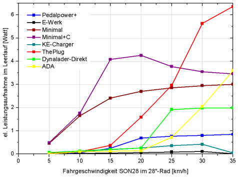 Bis auf den Forumslader haben die hier getesten Adapter keinen Schalter, um sie vom Nabendynamo zu trennen, wenn sie nicht gebraucht werden. Wer ein Gerät zur GPS-Navigation am Lenker betreibt, kommt selten in diese Situation. Wer nur gelegentlich etwas auflädt, sollte hingegen schon versuchen, unnötige Leerlaufverluste nach Beenden dieses Vorgangs zu vermeiden. Beim E-Werk ist dies allerdings unnötig. Auch bei schneller Fahrt bleiben die Verluste stets unter 0,1 Watt. Der KE-Charger bleibt mit maximal 0,4 Watt auch noch im vernachlässigbaren Bereich. Bei den anderen Adaptern sollte man über das Nachrüsten eines Schalters auf dem Weg zum Nabendynamo nachdenken.
