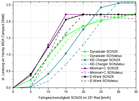 Seit Januar 2010 ist der kleine, leichte, verlustarme Nabendynamo SONdelux auch für 28″-Räder zugelassen. Ein Teil seiner geringeren Verluste ist aber auch geringerer elektrischer Leistung bei Langsamfahrt geschuldet. Was bedeutet das für die Ladeadapter? Eine Auswahl wurde bei sonst unverändertem Setup mit einem Laufrad mit SONdelux vermessen. Die geringsten Unterschiede zum SON28-Betrieb gibt es bei Nutzung der »Minimal«-Lösung mit Serienkondensator. Ab Tempo 15 steht auch mit SONdelux volle Leistung zum Laden eines MDA Compact bereit. Beim E-Werk sind ab etwa 20 km/h keine Unterschiede mehr da. Der Dynalader Direkt liefert am SONdelux sogar bei höherem Tempo mehr Leistung als am SON28. Beim KE-Charger hingegen sinkt die ohnehin geringe Leistung bei mittlerem Tempo noch weiter ab.