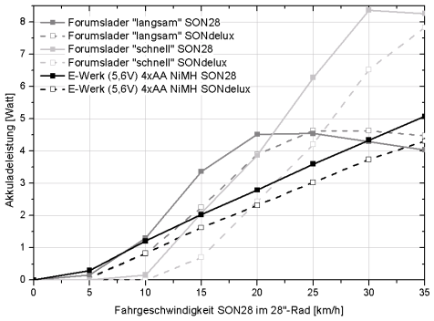Beim Forumslader mit seinen immensen Reserven sollte für den Durchschnittsnutzer im »langsam«-Mode kein Unterschied durch die Dynamowahl festzustellen sein. Bei mehr als 24 km/h ist der Ladestrom beim SONdelux sogar höher. Auch bei der Kombination E-Werk mit Akkupuffer ist der Unterschied gering. Die etwas geringere Ladeleistung lässt sich z. T. auch durch höhere Fahrgeschwindigkeit mit dem verlustärmeren Generator ausgleichen.