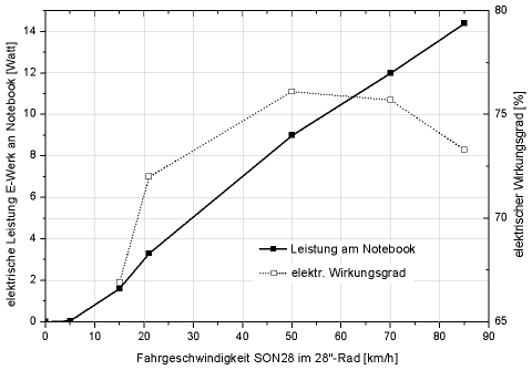 Das E-Werk wird mit eindrucksvollen »bis zu 16 Watt« beworben und liefert in höchster Einstellung 13,3 Volt. Das sollte reichen, um gängige Note- oder Netbooks mit 3- bzw. 6-Zellen-Akkupacks aufzuladen. Zum Versuch stand ein HP NC6000 Business-Notebook parat. Hiermit kann bis zu höchster denkbarer Downhill-Geschwindigkeit volle verfügbare Leistung aus dem E-Werk entnommen werden. Bis Tempo 30 entspricht die Ladeleistung recht genau dem oben betrachteten Fall der Aufladung von 4 NiMH-Zellen. Danach steigt die Leistung weiter linear mit der Drehzahl an. Bei 85 km/h kann man immerhin mit 14,4 Watt laden – leider fährt man selten so schnell …