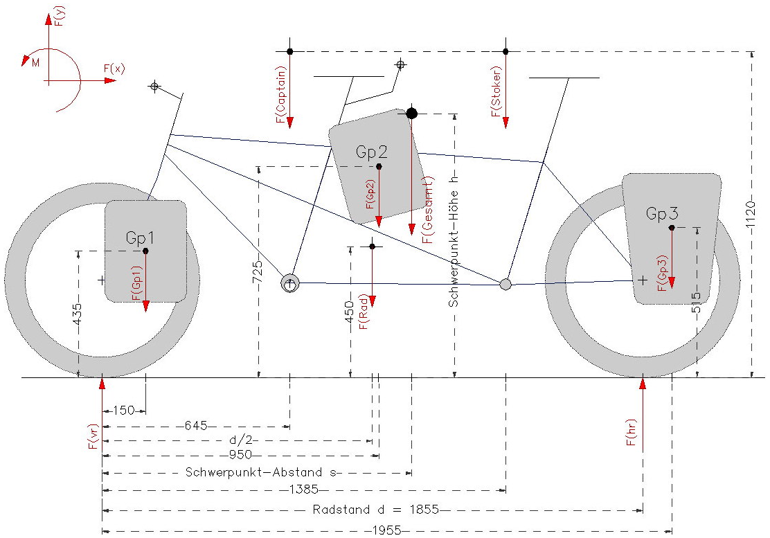 - Für die Gabel-Dimensionierung ist zu beachten, dass ein Tandem beim Bremsen auf Grund der günstigeren Schwerpunktlage auch bei griffiger Fahrbahn bis zum Blockieren des Vorderrades abgebremst werden kann. Ich setze voraus, dass die Bremskraft der Vorderradbremse eine solche Vollbremsung erlaubt. Nach Santana-Angaben sind die Belastungen einer Tandemgabel etwa 3 bis 5 Mal höher als die beim Solo-Rad. Diese Angabe entspricht eigenen Berechnungen. Zu schwach dimensionierte Gabeln können bei hoher Beanspruchung – selbst wenn sie nicht völlig versagen – die Straßenlage eines Tandems durch sich aufschaukelnde Schwingungen gefährlich destabilisieren.