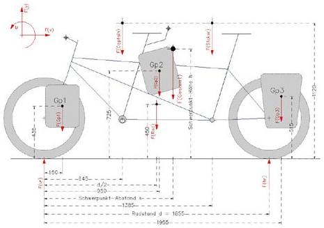 - Besondere Aufmerksamkeit ist aus eigener Erfahrung den Symmetrieeigenschaften einer Gabel bezüglich ihrer Belastungen und Verformungen zu zollen. Die Konstruktion soll unter normalen Fahrbedingungen, aber auch unter den extremen Bedingungen der Vollbremsung ein sicheres Fahrverhalten des Tandems und ein Nichtverwinden der Gabel gewährleisten.