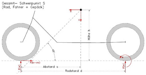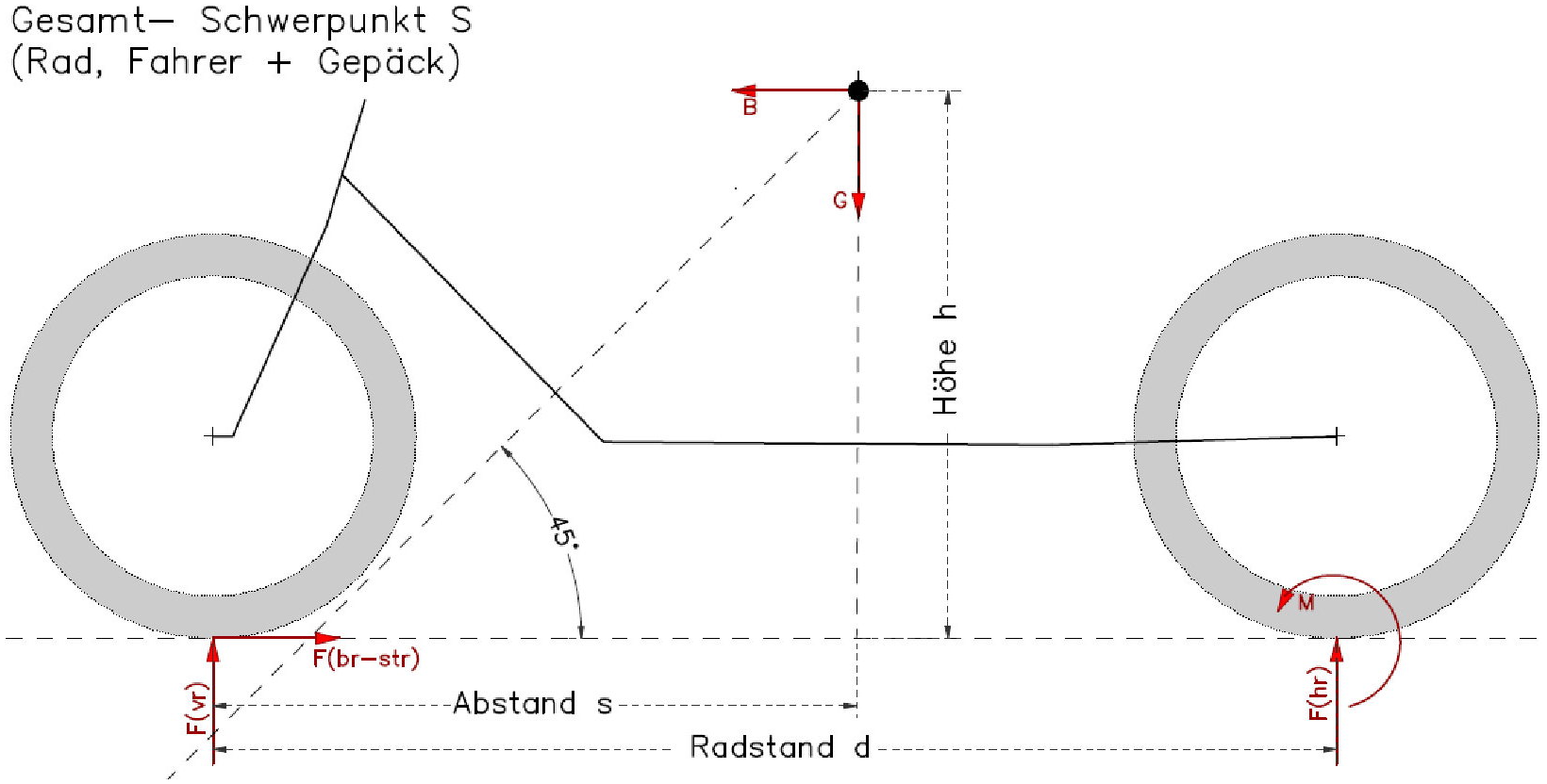 Mit Hilfe der Schwerpunktlage lässt sich nun die dynamische Belastung am Vorderrad, abhängig von der maximal möglichen Bremsverzögerung, berechnen. In der Skizze unten sind die zu berücksichtigenden Kräfte eingezeichnet.