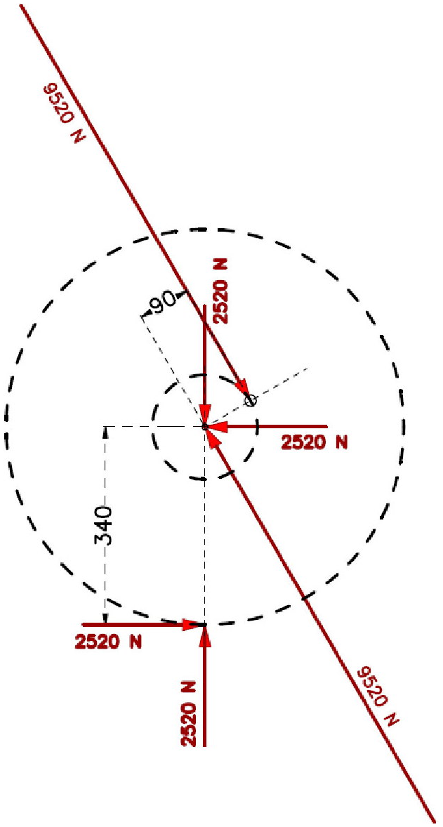 Für die nun folgenden Berechnungen der Biegebeanspruchungen an der Gabel wird eine Vorderrad-Belastung von 90 % der Gesamt-Gewichtskraft zugrunde gelegt, also 2.520 N.