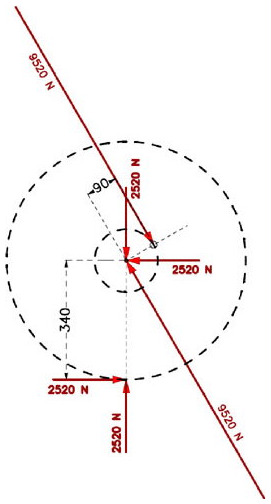 Aus der oben rechts dargestellten Skizze ergibt sich, dass, resultierend aus der Übertragung des Bremsmomentes, der linke Holm zusätzlich mit einem Biegemoment von 857 Nm belastet wird.