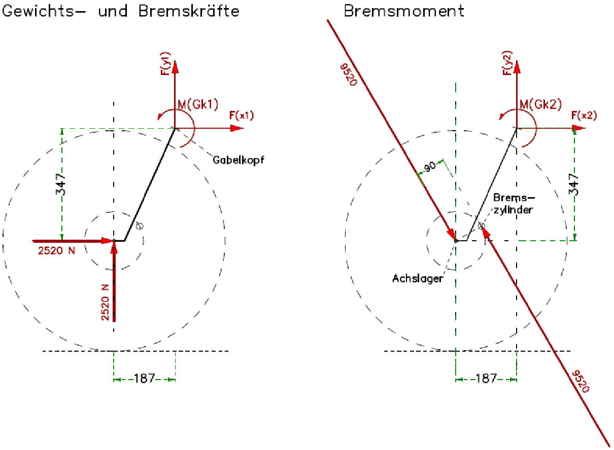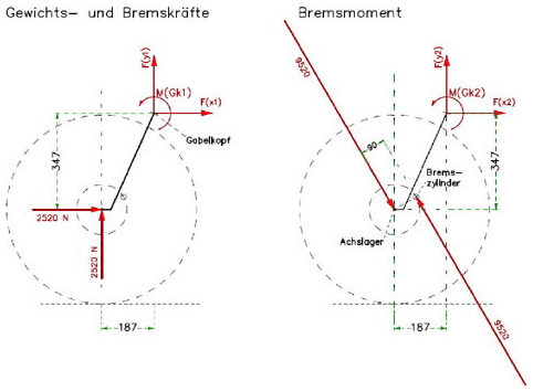Aus den Angaben der oben links dargestellten Skizze ergibt sich, dass, verursacht durch die Gewichts- und Bremskräfte, auf jeden Holm der Gabel eine Biegebeanspruchung von je 202 Nm am Gabelkopf wirkt.