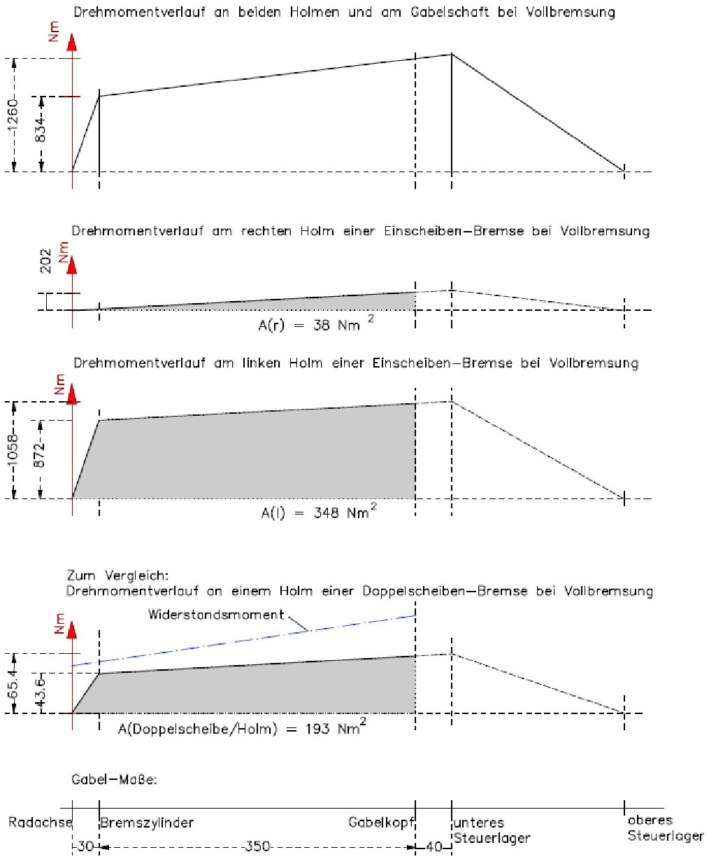 Die Berechnungen belegen, dass es technisch nicht möglich ist, eine zweiholmige Gabel für eine einseitig wirkende Bremse so zu bauen, dass sie allen Fahr- und Bremssituationen optimal angepasst ist.