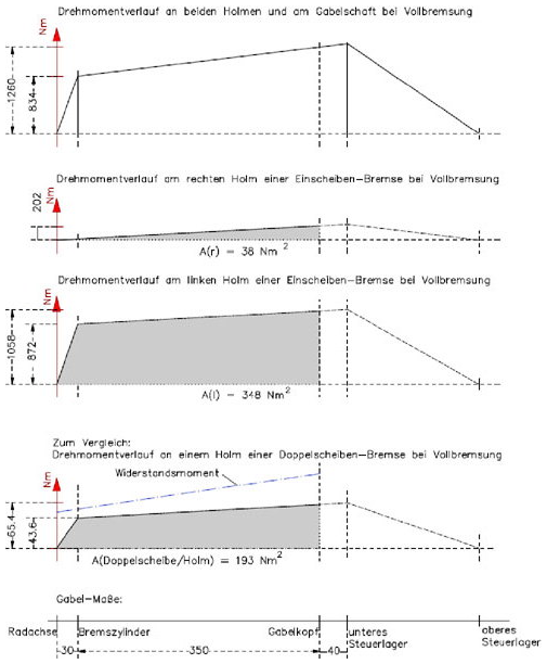 Der linke Gabelholm einer mit einer Scheibenbremse ausgerüsteten Tandem-Gabel wird im Fall der Vollbremsung im Vergleich zum rechten Holm bezüglich der Biegung 5,3-fach höher belastet als der rechte. Die Durchbiegung steigt bei symmetrischer Bauweise der Gabelholme auf Grund des differierenden Drehmomentverlaufs am linken Holm auf den 9-fachen Wert der Verformung des rechten Holms Auch bei nicht so extremen, üblichen Bremsbelastungen wird auf die Gabelholme ein verwindendes Moment ausgeübt. Im Fall des Dahinrollens ohne Bremsung dagegen sind die Belastungen nach Richtung und Betrag rechts und links gleich.