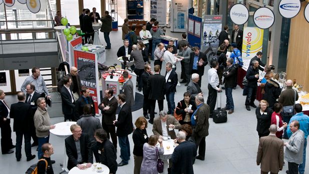 Als Rahmen der Veranstaltung dienten eine Reihe kleiner Messestände im Foyer, wo ausgesuchte Hersteller interessante Lösungen fürs Alltagsrad vorstellten. Busch&Müller zeigte hier sein Nabendynamo-Ladegerät »E-Werk« und schilderte die Fallstricke im riesigen Markt der Mobilgeräte. Zudem gab es erstmalig den neuen LED-Scheinwerfer Lyt in seriennaher Form zu bestaunen. Utopia hatte ihr Pedelec-Konzept »E-Support« mitgebracht. Ein eindrucksvoller Kabelbaum verbindet dabei Steuerung am Lenker und Akkupack seitlich am Tubus-Spezialgepäckträger. Die Steuerung speichert viele Informationen – z. B. Zahl und Umfang der Ladevorgänge. Utopia garantiert 1.000 Ladevorgänge für den Akku. Der Arbeitskreis B.A.U.M. bewarb seinen Wettbewerb zum fahrradfreundlichsten Arbeitgeber.