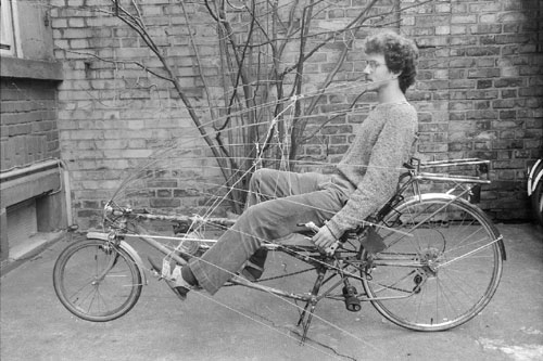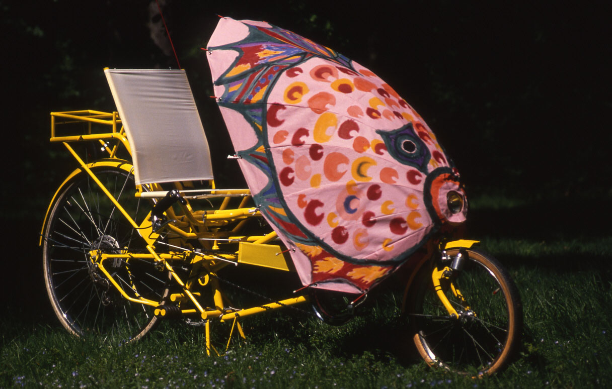 Ich selbst habe mit einer fest an meinen Langlieger angebauten Verkleidung aus Stoff, der über Glasfaserstäbe gespannt war, begonnen (Bild 1–3). Vorne am Rad war ein Blechring mit lauter Stahlröhrchen angelötet, in welche die Stäbe gesteckt wurden. Die Verkleidung ließ sich für Zugfahrten abnehmen, war aber dann recht sperrig. Die Bemalung zum Fisch auf leuchtend rosa Grund war nötig, da das Rosa des ehemaligen Stoffrollos kaum jemandem gefiel.