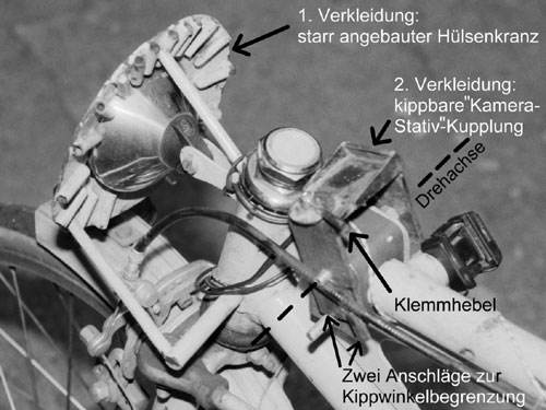 Zuerst war innen an der Verkleidung Klettband angebracht (entlang dem Bügel (4)), um ein Regenponcho mit aufgenähtem Gegenklettband daran befestigen zu können. Inzwischen verzichte ich darauf, weil man auch ohne die Befestigung des Ponchos an der Verkleidung nicht nass wird. Die Kupplung (8) ist zu starr und neigt dazu, alle paar Jahre abzubrechen. Ein Polyurethan-Element zur Verbindung wäre praktischer. Die Verkleidung selbst besteht aus einem U-förmigen Stahlrohr (2), in das seitlich des Fahrers zwei Rohre (3) eingesteckt sind.