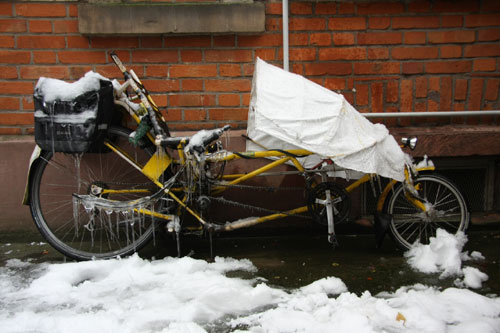 Wenn man bei Regen ungeschützt Fahrrad fährt, wird man nass. Wenn es schneit, ist die Situation nur in sofern besser, als dass die Oberfläche der Kleider schnell unter den Gefrierpunkt abkühlt und dann die meisten Schneeflocken nicht haften bleiben. Die Kleidung wird also erst später nass.