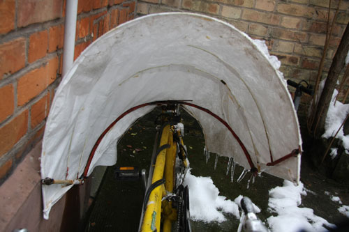 Andere Stoffe für die Verkleidung halten auch nicht länger. Ein schwereres Material wie Lastwagenplane wäre haltbarer, ist aber schwerer zu verarbeiten und wiegt mehr, was erfordern würde, die Befestigung der Verkleidung zu ersetzen. Und dazu kann ich mich nicht aufraffen: das Fahrrad hat mich inzwischen 1,5 Mal um die Erde befördert auf dem 12 km Weg zur Arbeit, es ist 21 Jahre alt und da ändert man nicht eben mal etwas Bewährtes.
